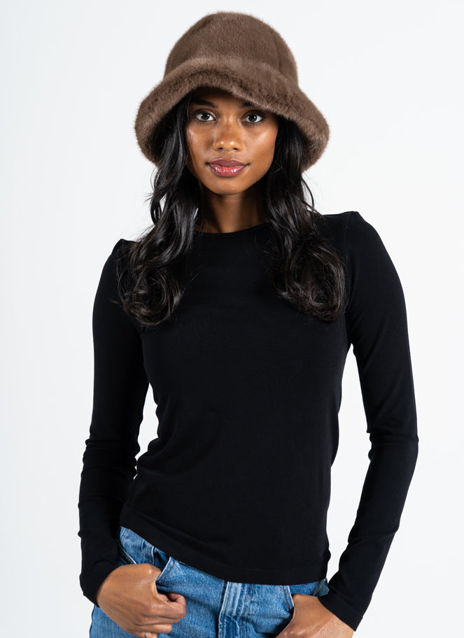 An iconic bucket hat made with faux fur! Perfect for staying on trend with still staying warm.